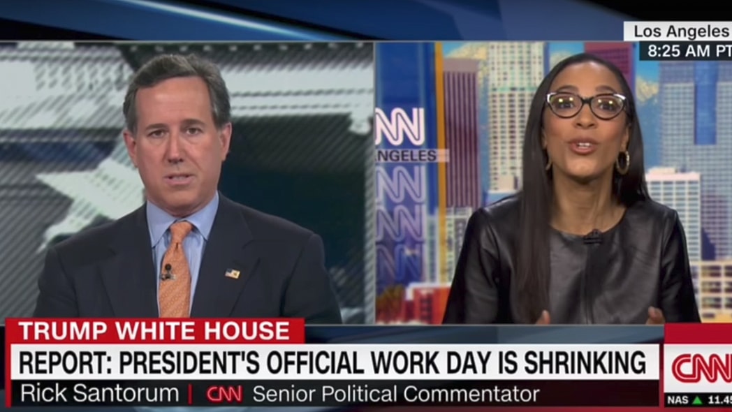 During a discussion about reports that Trump was taking “executive time” in the morning and therefore shrinking the time he spent working in the Oval Office, Santorum suggested that it was perfectly normal for someone to need “down time” in a stressful job like the presidency.