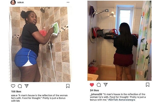 ” the picture was initially captioned, showing La Negra in a skin tight bodycon dress supposedly cleaning her man’s bathtub.