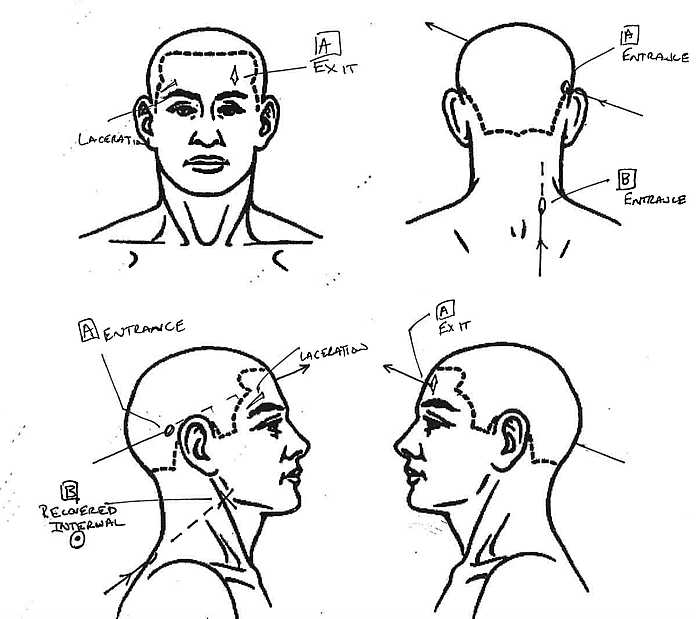 The autopsy report indicates that there were three gunshot wounds (one each) to the head, neck, and torso with no specific order of occurrence. The gunshot wound to the head came to the back of the head and exited through his face. The wound to the neck came from the right side of the back of the neck and exited the right side of his throat. The wound to the right side of the back of the hip and was recovered from his abdominal wall.