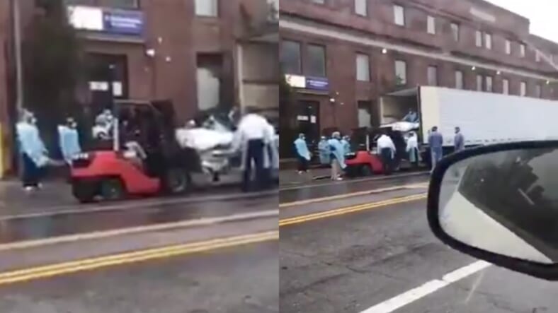 The voice of a grief-stricken Brooklyn man can be heard on a video he captured appearing to show medical personnel removing wrapped bodies out of Brooklyn Hospital of people who died from the coronavirus and placing the bodies inside of a truck.