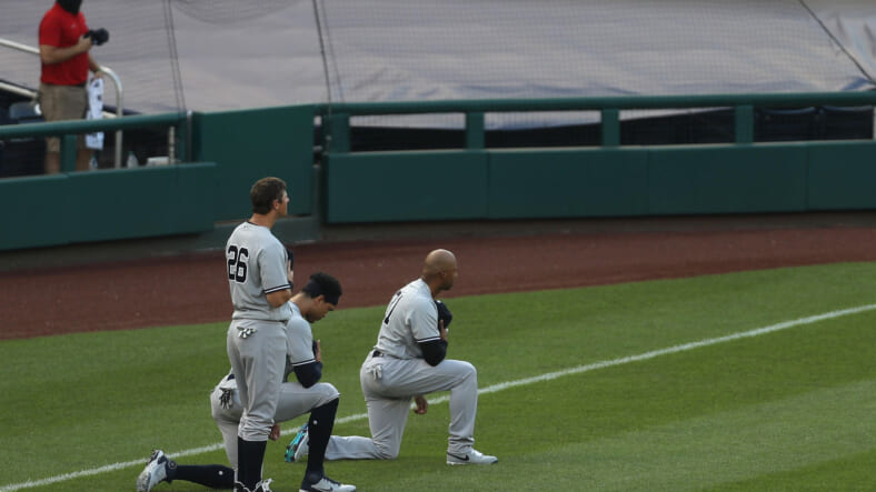 All Yankees and National players and coaches took a knee before their matchup at the Thursday season opener at Nationals Park in Washington, D.C. In front of an empty stadium in the midst of a coronavirus pandemic, participants kneeled for 20 seconds prior to the playing of a pre-recorded rendition of the national anthem. The Yankees were in town for a three-game series.