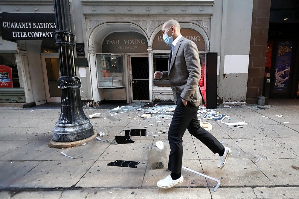 Stores miles from downtown were also ransacked, with parking lots littered with glass and items from inside the stores. Clothes hangers and boxes that once contained television sets and other electronics were seen — evidence that thieves had taken racks of clothes and removed them from the hangers.