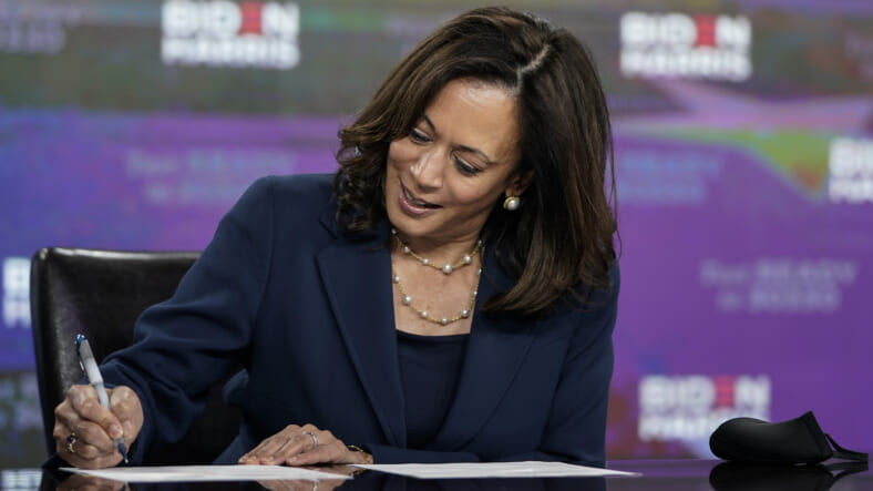 Presumptive Democratic vice presidential nominee, U.S. Sen. Kamala Harris signs required documents for receiving the Democratic nomination for Vice President of the United States at the Hotel DuPont on August 14, 2020 in Wilmington, Delaware. Harris is the first Black woman and first person of Indian descent to be a presumptive nominee on a presidential ticket by a major party in U.S. history. (Photo by Drew Angerer/Getty Images)