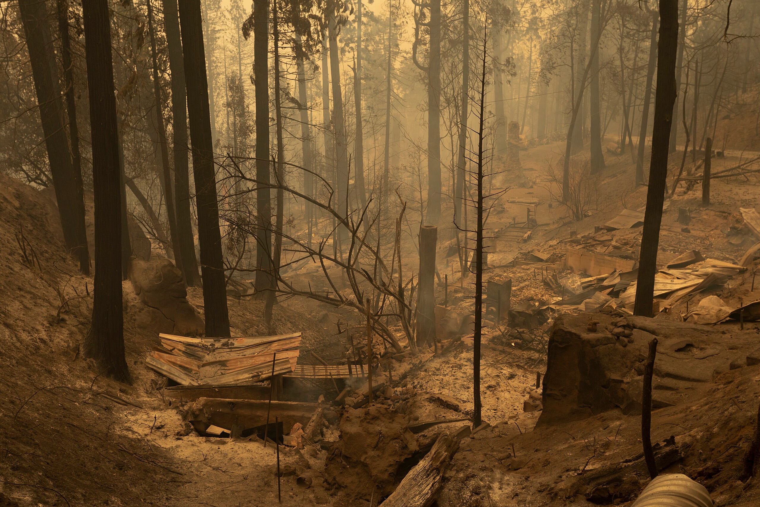 Many of the most destructive fires sparked in Northern California, where hills and mountains dotted with many dead trees have provided plenty of fuel for fires igniting amid high temperatures and strong winds fanning the flames. Thick, gray smoke from the blazes has fouled the air in many hill communities and major cities in the San Francisco Bay Area and beyond.