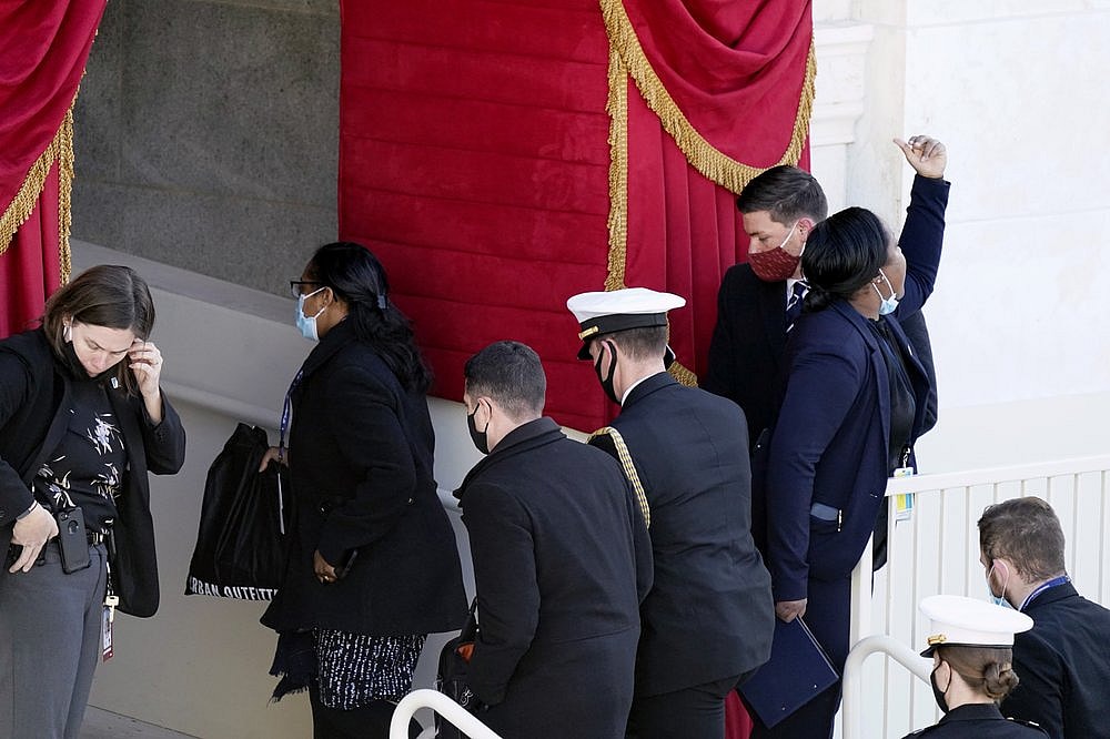 Participants were ushered from the West Front of the Capitol. Those who had gathered for a walk-through, including a military band, were directed to head indoors and moved in the direction of a secure location inside the Capitol complex.