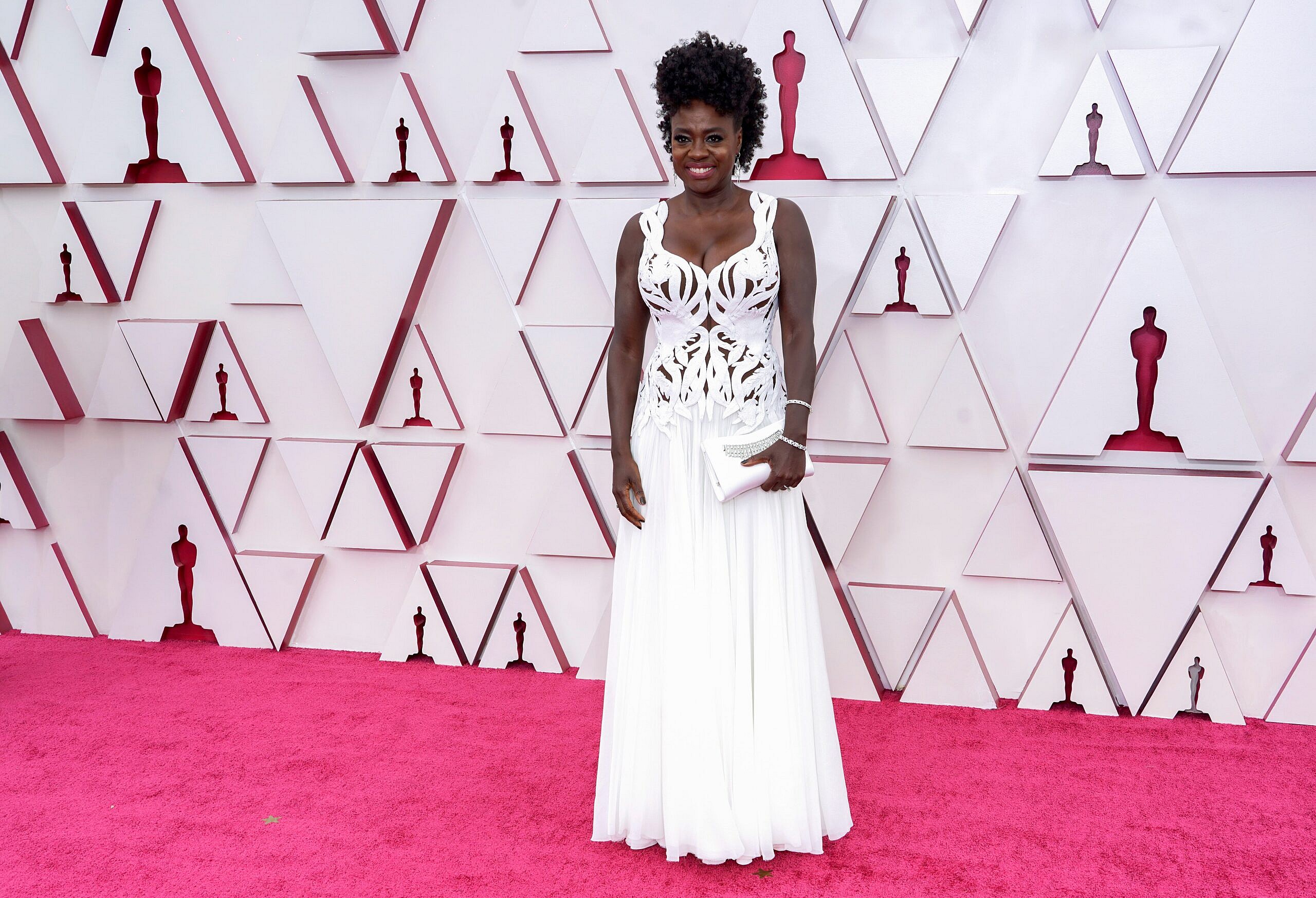 The beauty, who is nominated for Best Actress for her turn as Ma Rainey in Netflixu2019s adaptation of August Wilsonu2019s play Ma Raineyu2019s Black Bottom, showed up in a white gown from Alexander McQueen. Her embellished white clutch, diamond bracelets, and swept up curls complimented the ensemble.