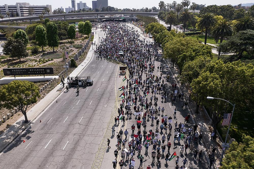Thousands of people shut down traffic on a major thoroughfare in west Los Angeles as they marched two miles from outside the federal building to the Israeli consulate. The protesters waved signs that said “free Palestine” and shouted “long live intifada,” or uprising.
