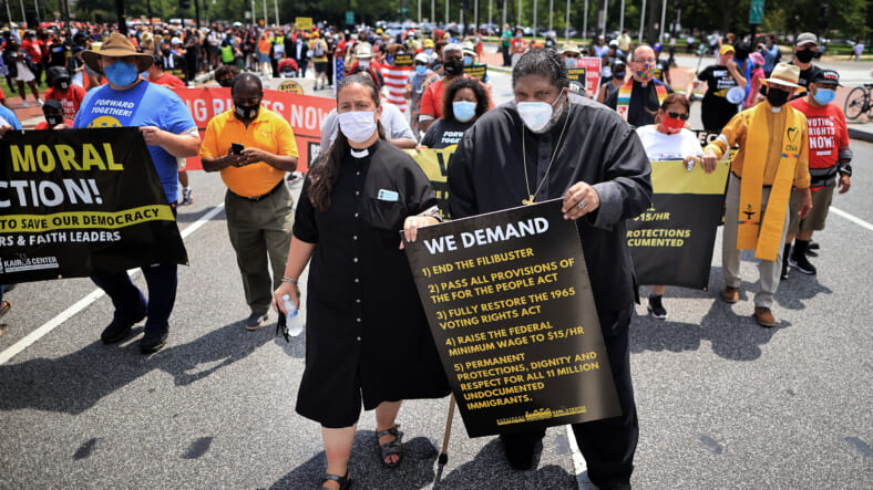 Hundreds were arrested last week outside the Senate Hart building near Capitol Hill in nonviolent direct action to demand voting rights, an end to the filibuster, and economic rights for all. Organized by the Poor People’s Campaign: A National Call for Moral Revival, the action brought together poor and low-wage workers, clergy and people of conscience, all committed to fighting for a multiracial democracy that works for everyone.