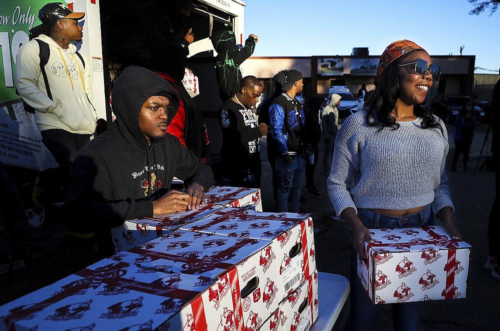 “When I hear his music, I just break down,” said Jones, who spoke with a reporter while sitting on the rear bumper of a U-Haul truck full of 300 turkeys. “The truth in all of it, and where he came from, that’s what really gets to me sometimes. This is what he would want us to do right here, still keep on giving. He came from nothing, but he wanted to make sure everybody got some.”