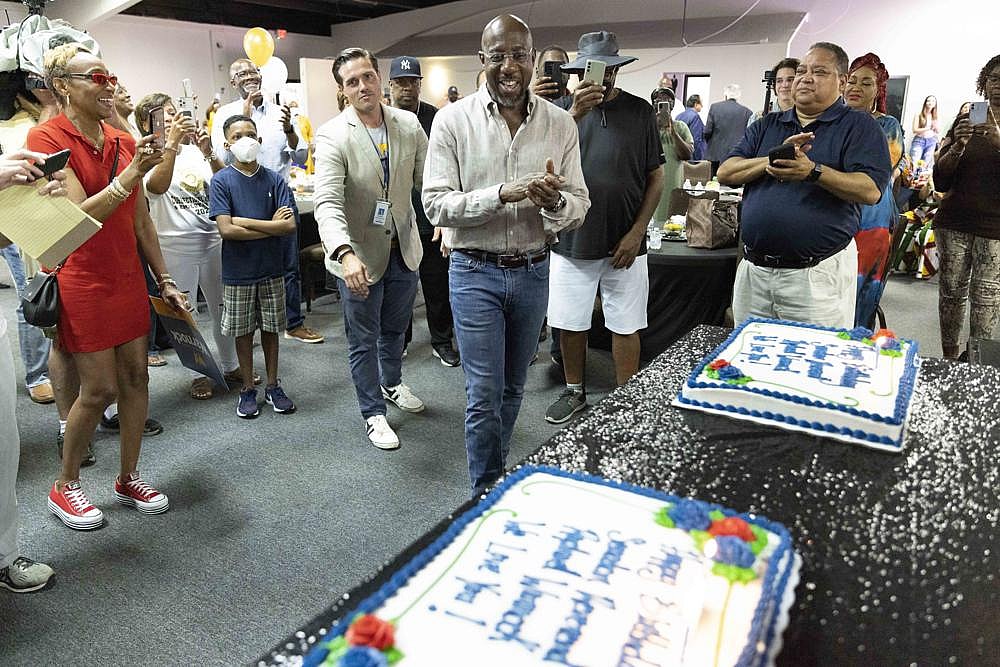 Standing over birthday cakes and candles, the senator fondly recalled his runoff victory and thanked Georgians who “gave us the narrowest majority.”