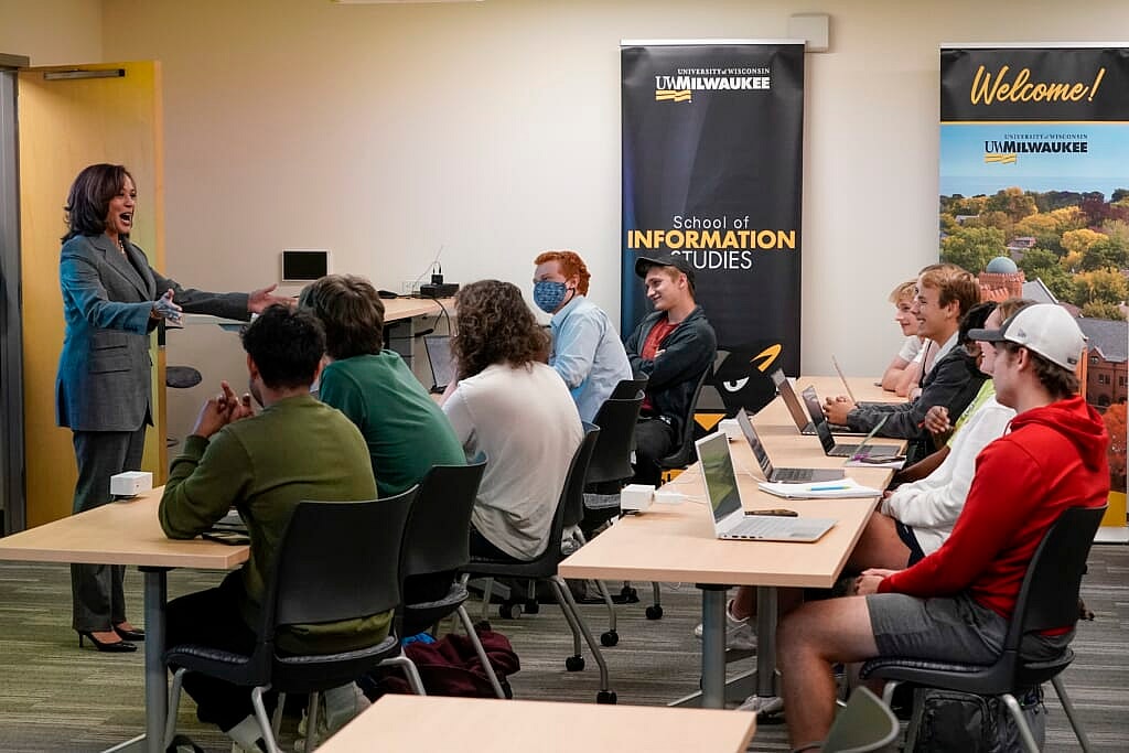 MILWAUKEE (AP) — Vice President Kamala Harris met with college students and Latino leaders in Milwaukee on Thursday, a visit meant to energize voters just under seven weeks before an election in which Democratic Gov. Tony Evers and Republican U.S. Sen. Ron Johnson are on the ballot.