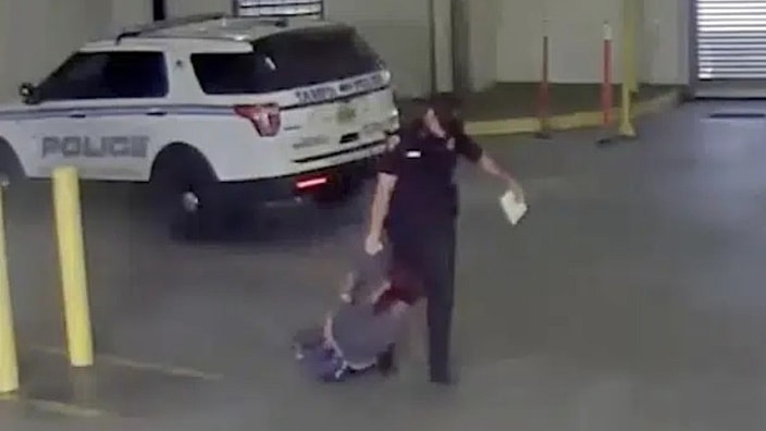 Damon then removes the woman from the vehicle and pulls her by the arm across a concrete floor, stopping once to tell her to get up but the woman refuses. Damon drags the woman to a doorway then buzzes for additional officers to assist him before the body camera video released by the Tampa Police Department cuts off.