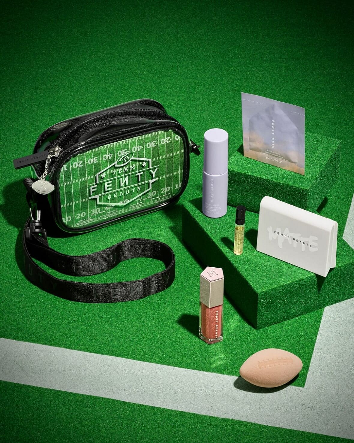 Riri’s Fenty Beauty line has also dropped “Game Day Essentials,” a collection of new items and remixed classics sold in an on-theme football field printed mini clutch complete with a little football-shaped makeup sponge. While the Game Day Essentials’ Showstopp’r Kit retails at $76, some items are available for individual purchase, starting at $12.