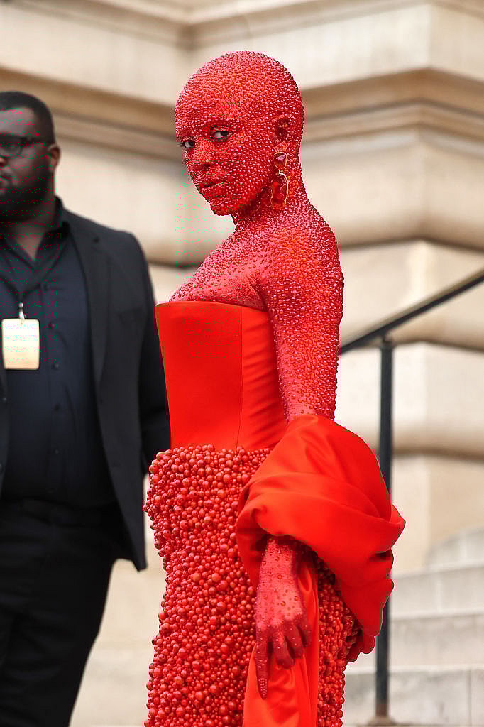 Most notably, the singer kicked the week off by attending the Schiaparelli show in head-to-toe red Swarovski crystals — literally. For the surreal look, Doja’s head, face, neck, chest, and arms were completely embellished in 30,000 blood-red crystals by legendary makeup artist Pat McGrath.