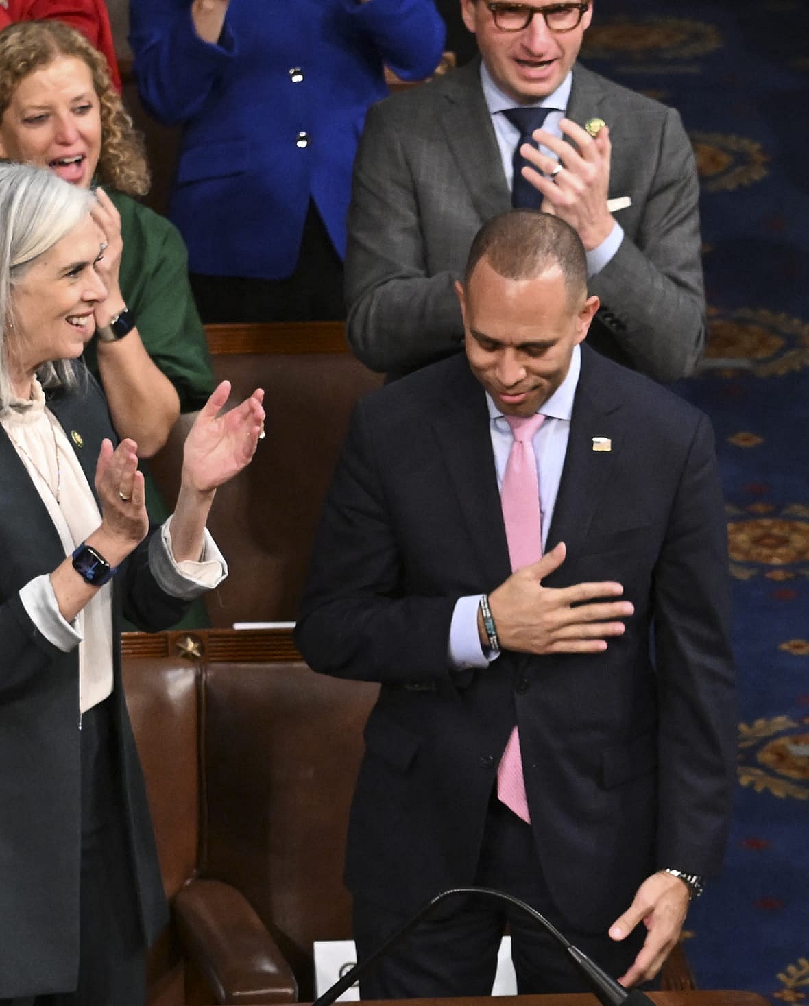 Early on in the address, President Biden, shortly after addressing House Speaker Kevin McCarthy, turned his attention to U.S. Rep. Hakeem Jeffries (D-N.Y.), who became the first Black minority leader in the U.S. House of Representatives. Jeffries, visibly humbled by the acknowledgment, silently gestured his appreciation.