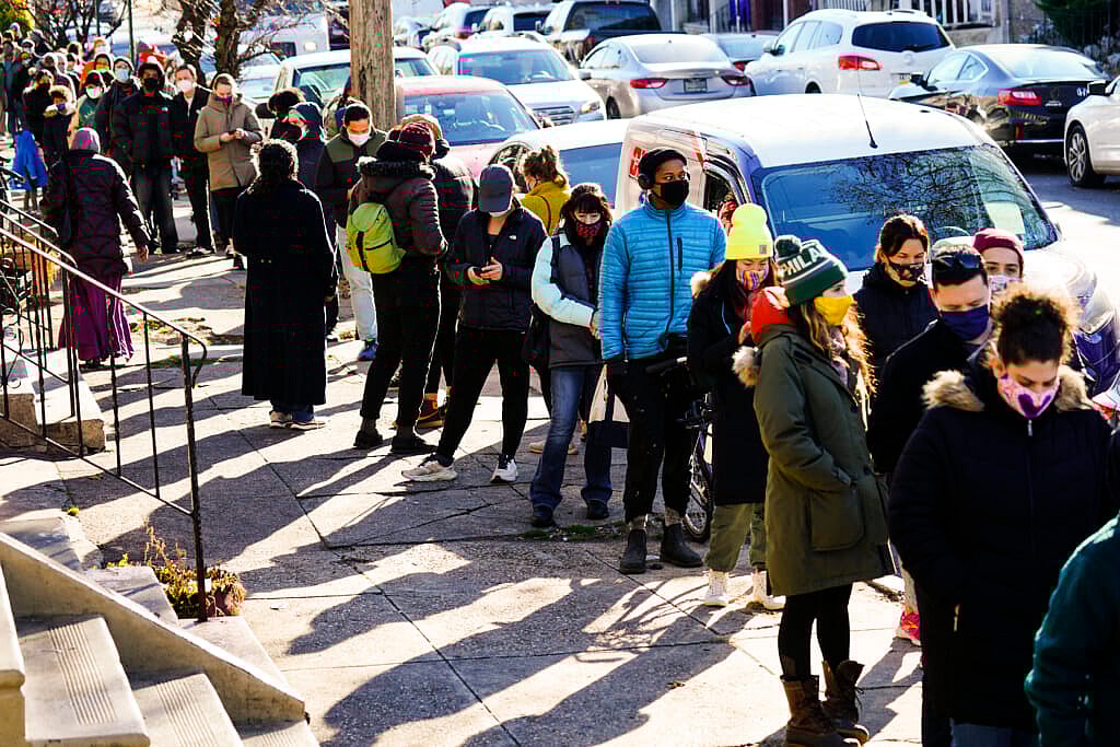 Residents wait in a line extending around the block to receive free at-home rapid COVID-19 test kits on Dec. 20, 2021 in Philadelphia. (AP Photo/Matt Rourke)