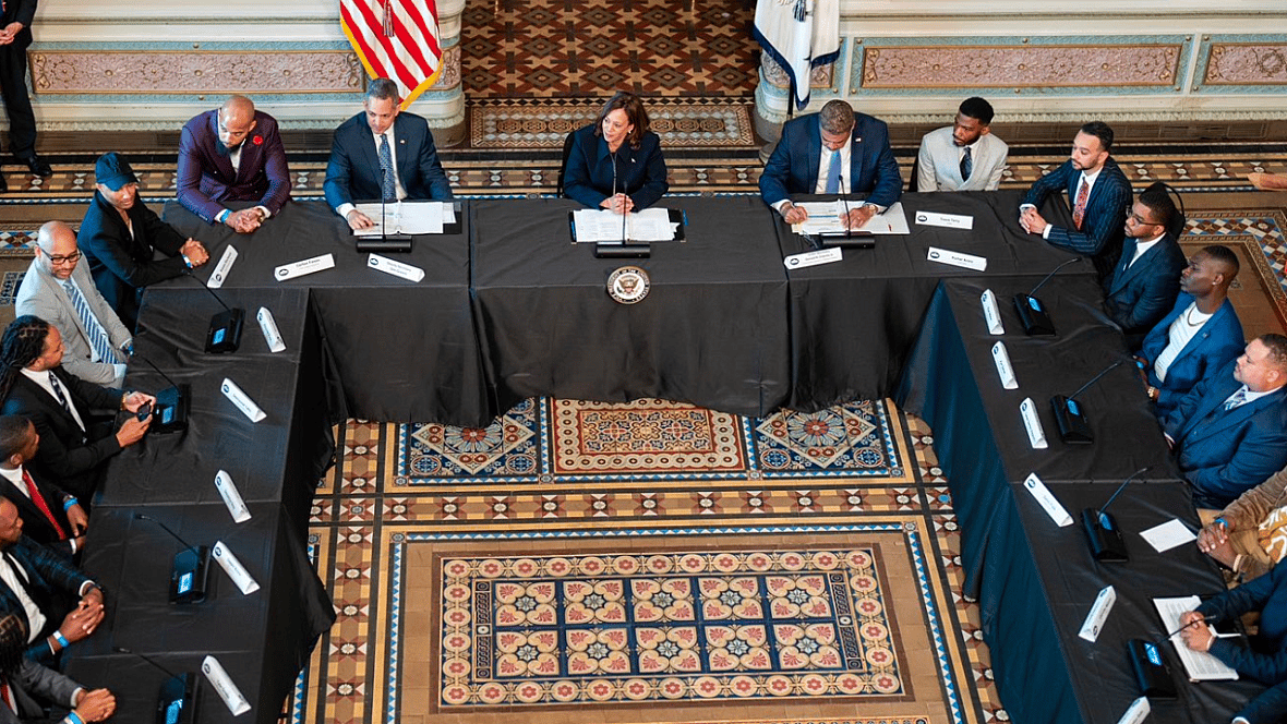Seated at the head of the table, Harris said she and administration officials invited the group of predominantly Black men to share their stories of success and the challenges they face in growing their businesses.