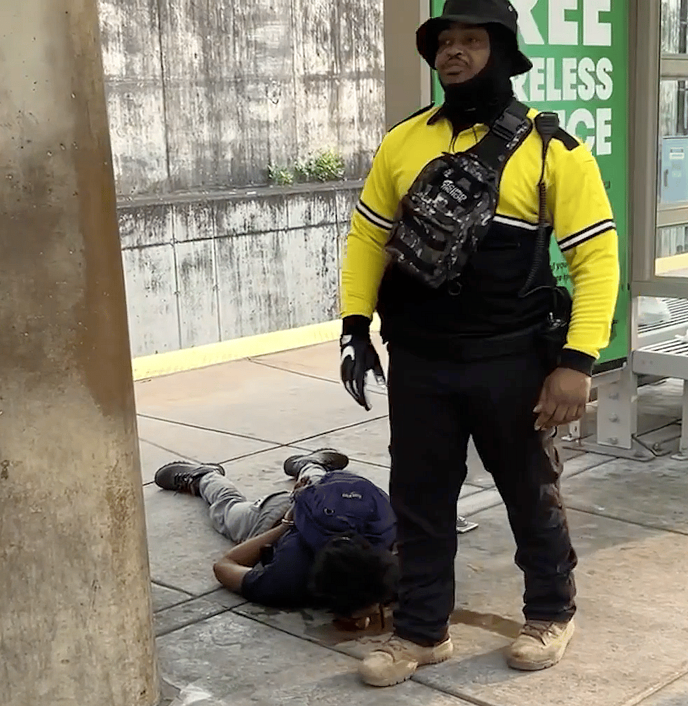 St. LOUIS (AP) — A security guard for the St. Louis light rail system repeatedly punched in the head a man lying facedown on a busy platform, as nearby commuters recorded video and shouted for him to stop.