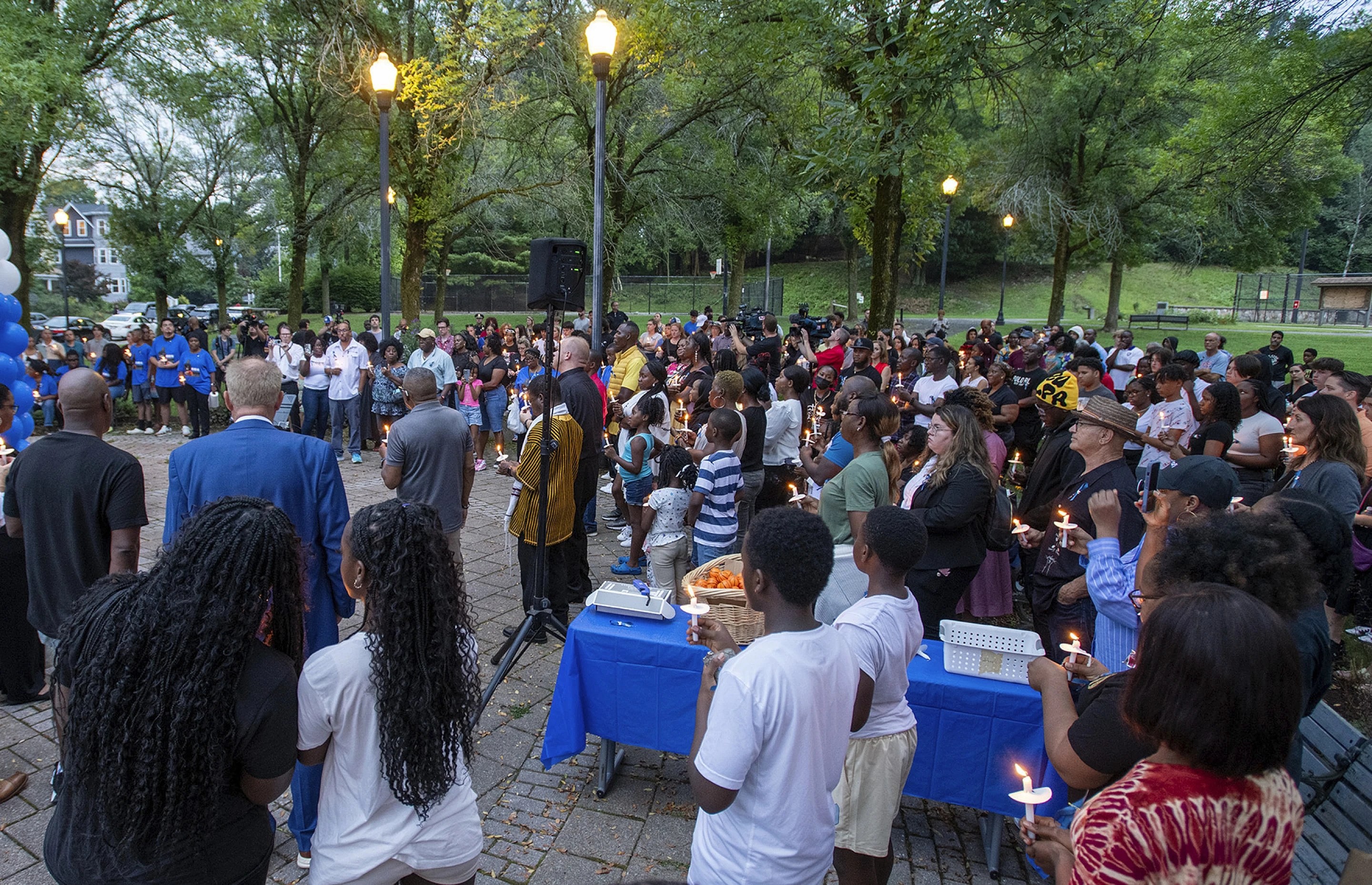 At the vigil Friday, a crowd of about 100, including many of Wolobah’s friends and teammates, turned out to a park in Worcester, down the hill from his home. They lit candles, swapped stories and ate pizza. Huge photos of the dread-locked teen hung from a statue, surrounded by his name in gold letters and blue and white balloons. Tiny basketballs were handed out.