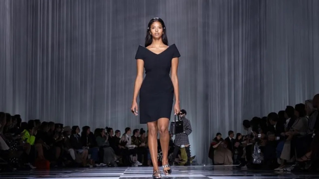 The University of Southern California student walked the Versace runway dressed in a chic black look reminiscent of ’60s Italian fashion, which included a black mini dress with oversized off-the-shoulder sleeves, a pair of metallic Mary Janes and a black leather mini purse.