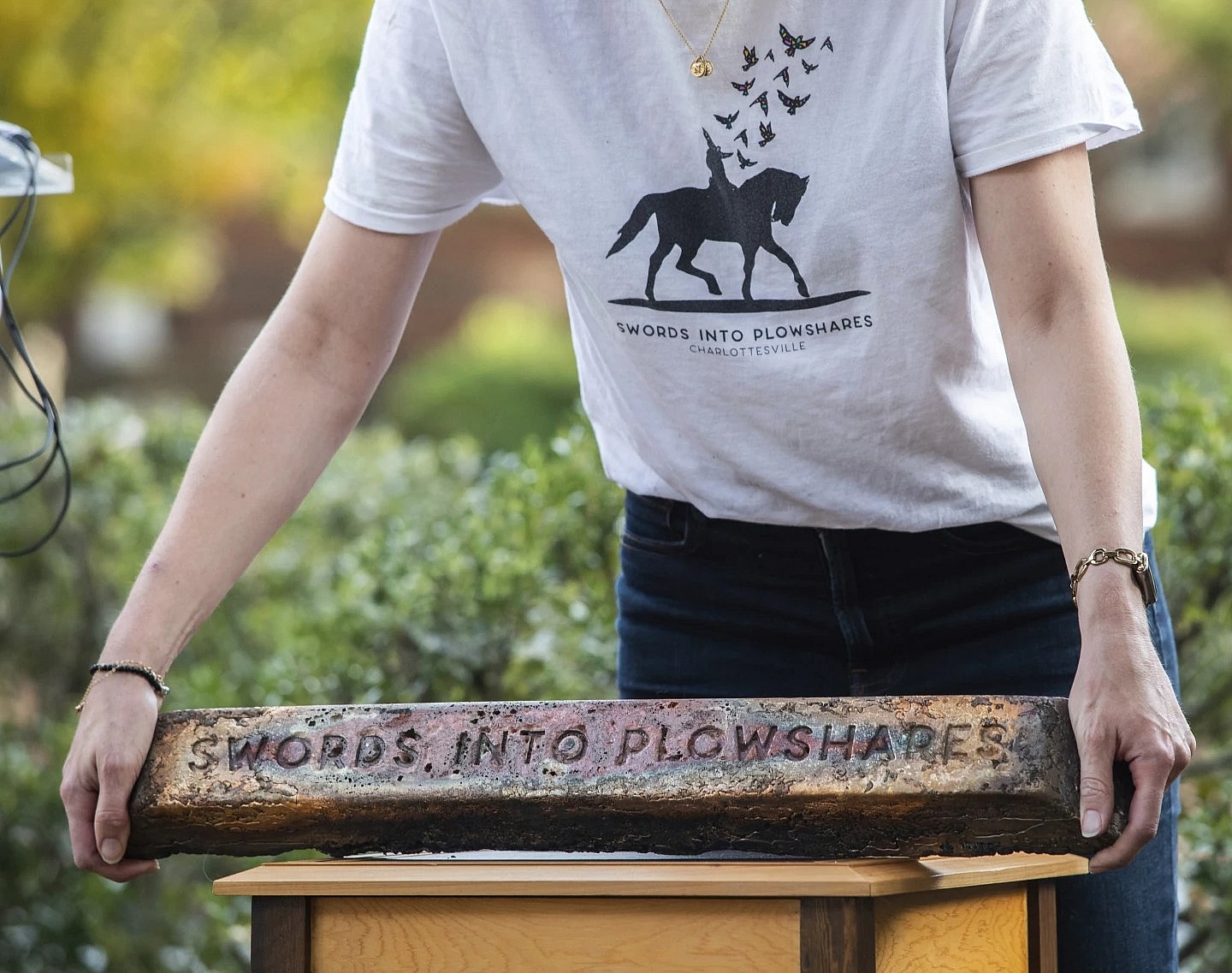 For now, the bronze from the statue has been molded into ingots stamped with the words “SWORDS INTO PLOWSHARES,” some of which were on display at the news conference.
