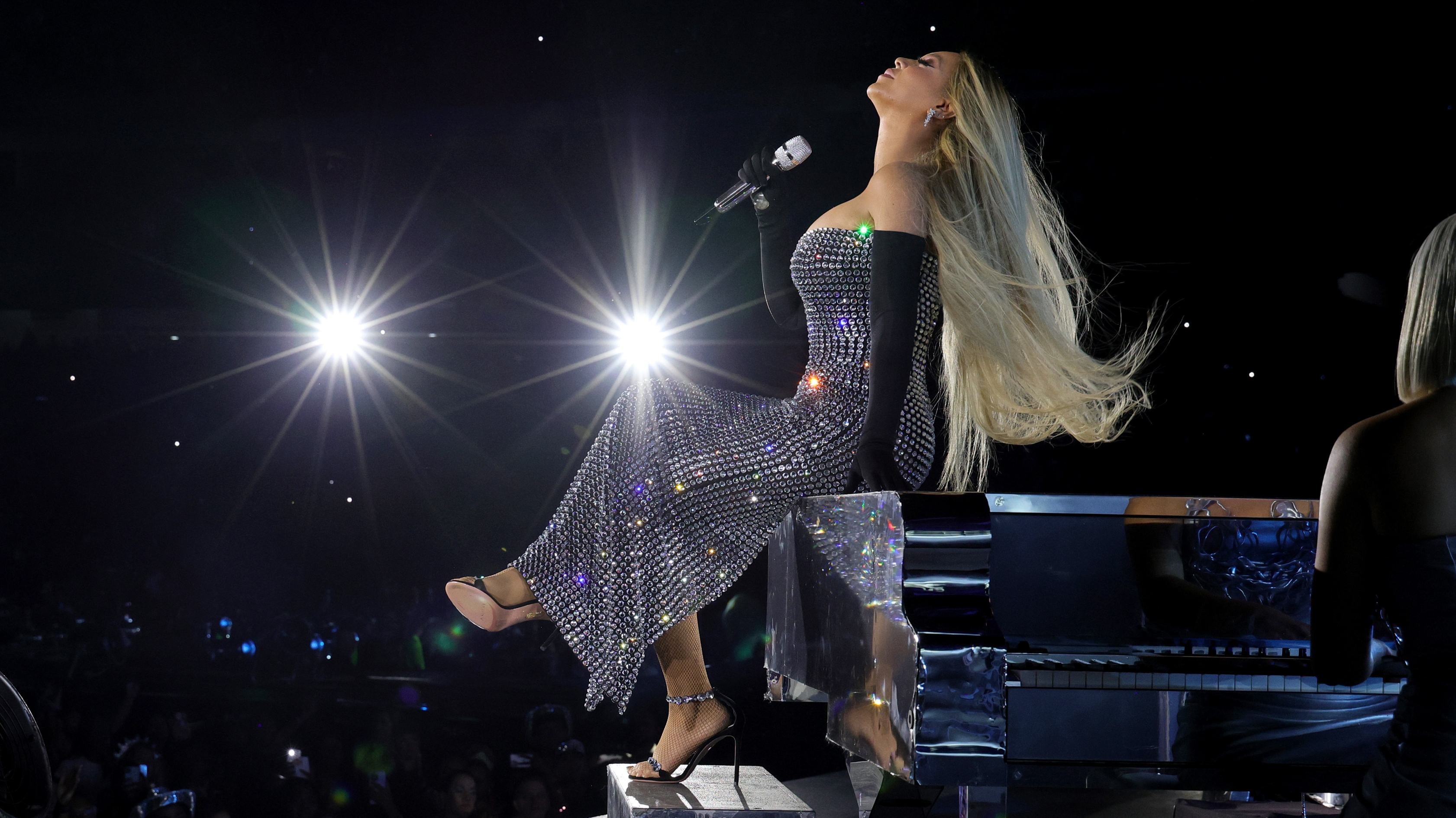 Beyoncé debuted a surprisingly icy new look for the premiere, wearing a strapless silver chainmail dress by Versace and sleek, Donatella-like white-blonde tresses. Some online commenters were jarred by the multi-platinum artist’s transformation, critiquing the megastar’s pale and shimmery look as too Eurocentric. However, as longtime stylist Shiona Turini indicated, the custom gown and styling were intended to evoke the artist’s hit song “Alien Superstar.”