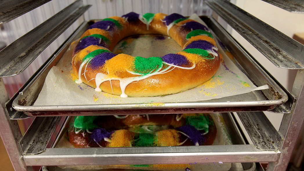 King cakes are among the foods most associated with Carnival in New Orleans. The rings of pastry are adorned with purple, green and gold sugar or icing, and they often have a tiny plastic baby hidden inside as a prize.