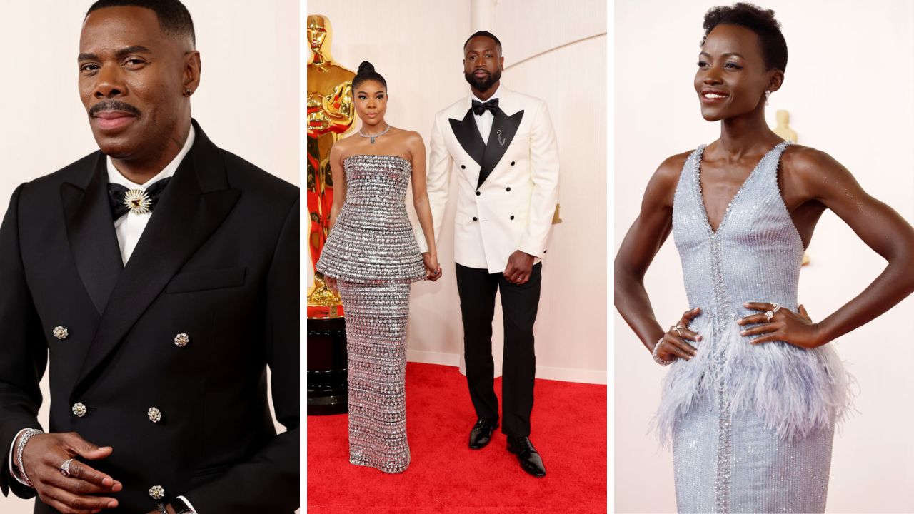 In addition to scoring in some major categories, Black nominees and attendees won the red carpet. Oscar-nominee Colman Domingo continued his awards-season style streak in a custom suit by Louis Vuitton accessorized with jewelry by David Yurman and matching gold-tipped Vuitton cowboy boots (which he joked were a nod to Beyoncé). Meanwhile, Lupita Nyong’o’s sequined gown was a sartorial nod to her first Oscar win ten years ago, as she joined Ava DuVernay and Da’Vine Joy Randolph in wearing one of the evening’s chicest shades: ice blue. As always, Gabrielle Union and Dwyane Wade nailed couples’ style (and landed atop several best-dressed lists in the process), with Union sparkling in a strapless two-piece skirt set by Carolina Herrera, accessorized with an emerald-cut aquamarine-and-diamond statement necklace by Tiffany and Co. Alongside his wife, Wade cut a dashing figure in a double-breasted black-and-white tuxedo by Atelier Versace.