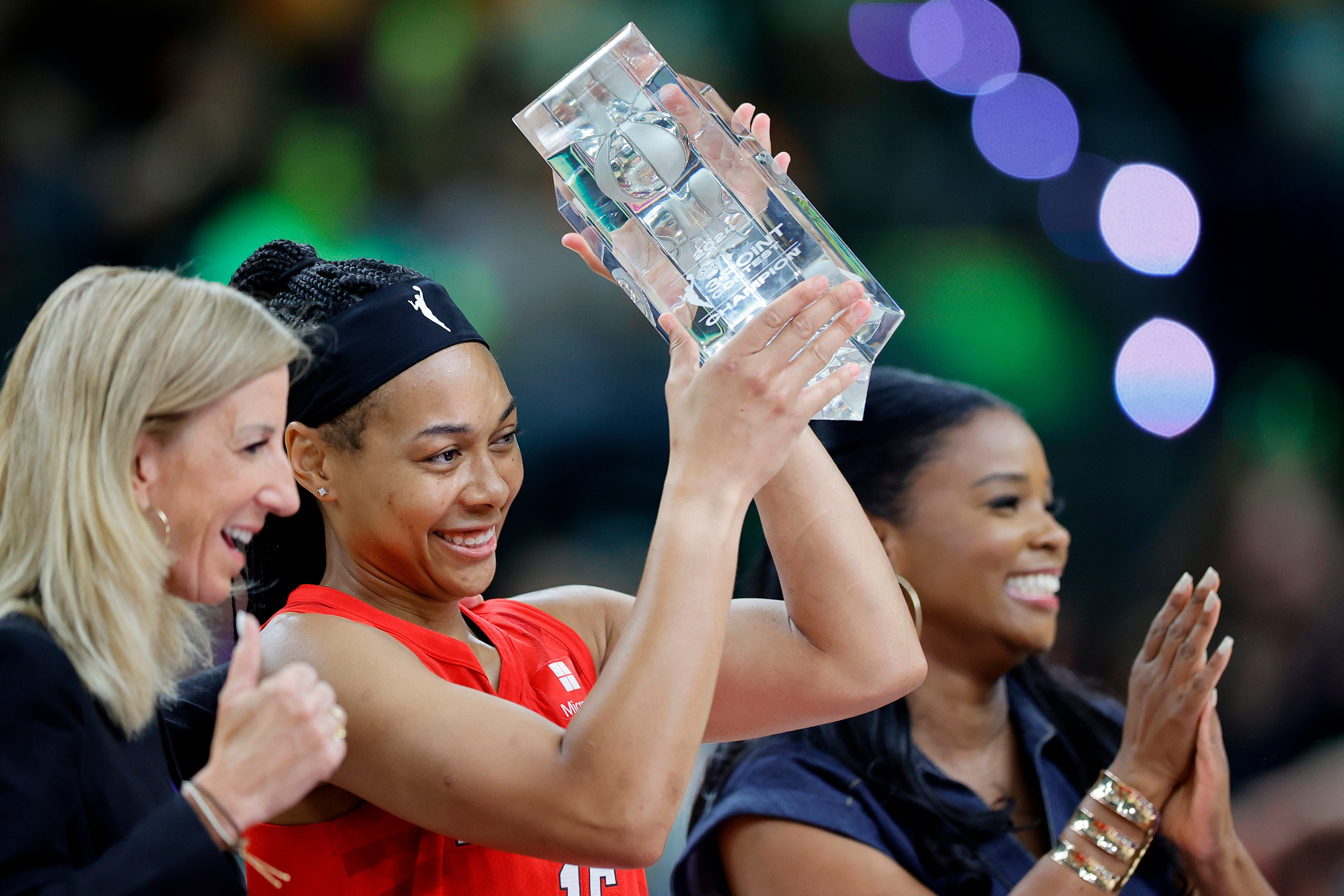 Jones was looking to become the first post-player to win the 3-point contest. She also made the finals in 2021 before losing to four-time champion Allie Quigley. Jones had a chance to win the contest, but her last shot — the two-point money ball — fell short. She held her head in disappointment.