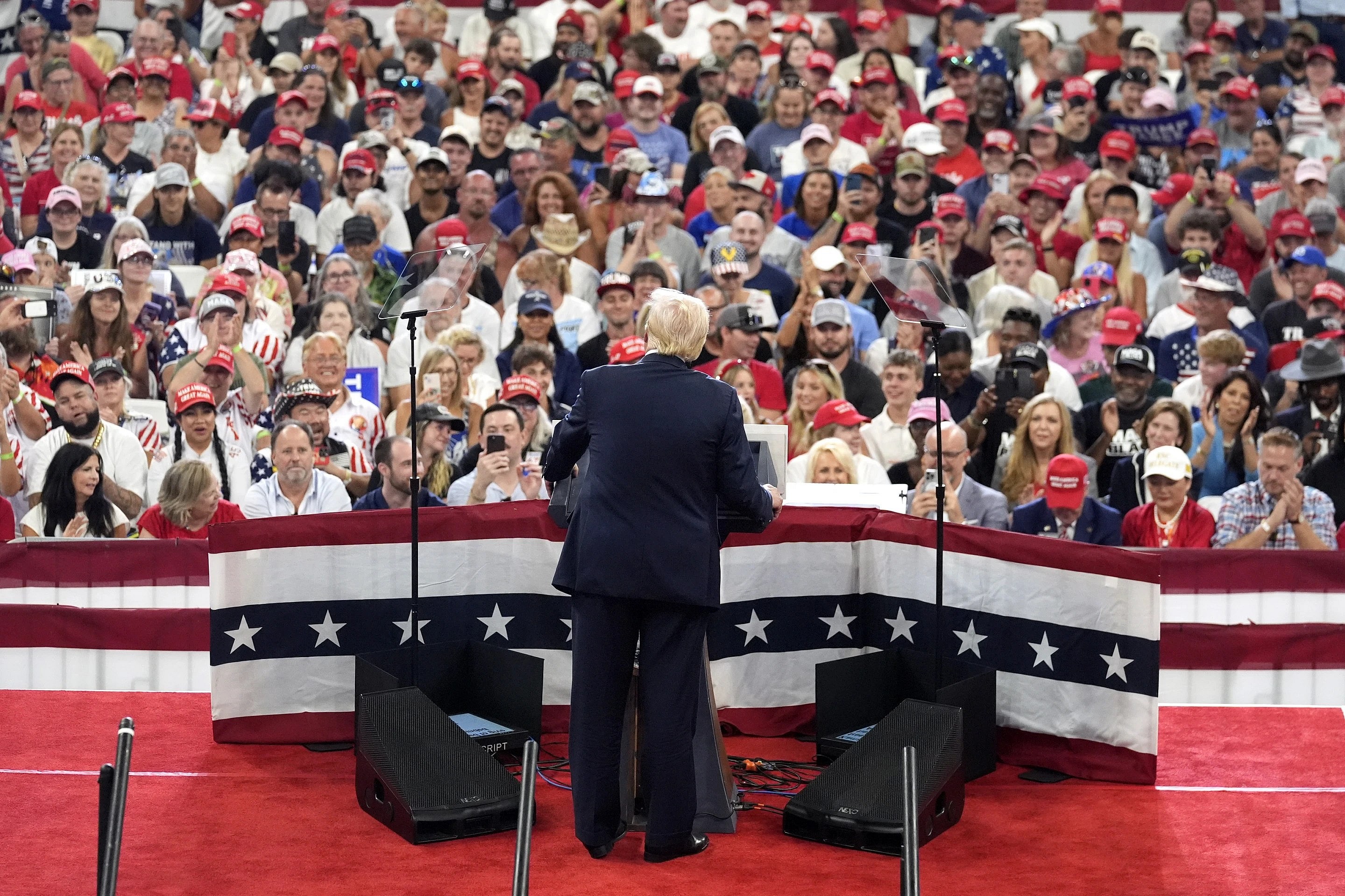 Trump drew an overwhelmingly white audience with a noticeable presence of Black voters. The playlist leaned to his eclectic musical tastes — the Village People and ABBA among them — but featured plenty of country music. The crowd erupted at the first notes of his signature walk-up song: “God Bless the USA,” by Trump supporter Lee Greenwood.
