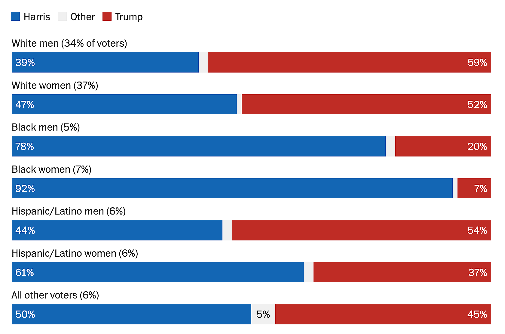 According to Washington Post exit polls, Black women overwhelmingly voted for Harris, with 92% voting for her — even higher than the number of Black women who voted for Biden in 2020.
