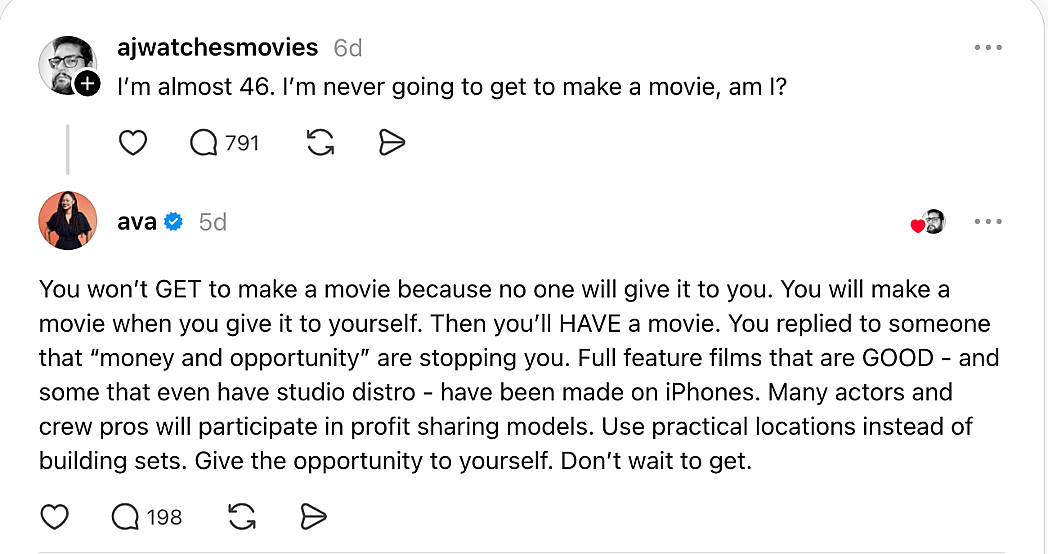 “You won’t GET to make a movie because no one will give it to you,” DuVernay replied. “You will make a movie when you give it to yourself. Then you’ll HAVE a movie.”