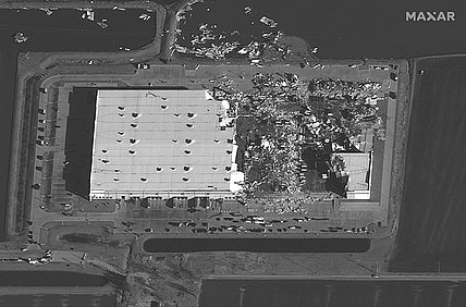 The damage to the Amazon building was extensive; the structure’s steel support pillars were exposed after the walls and roof…