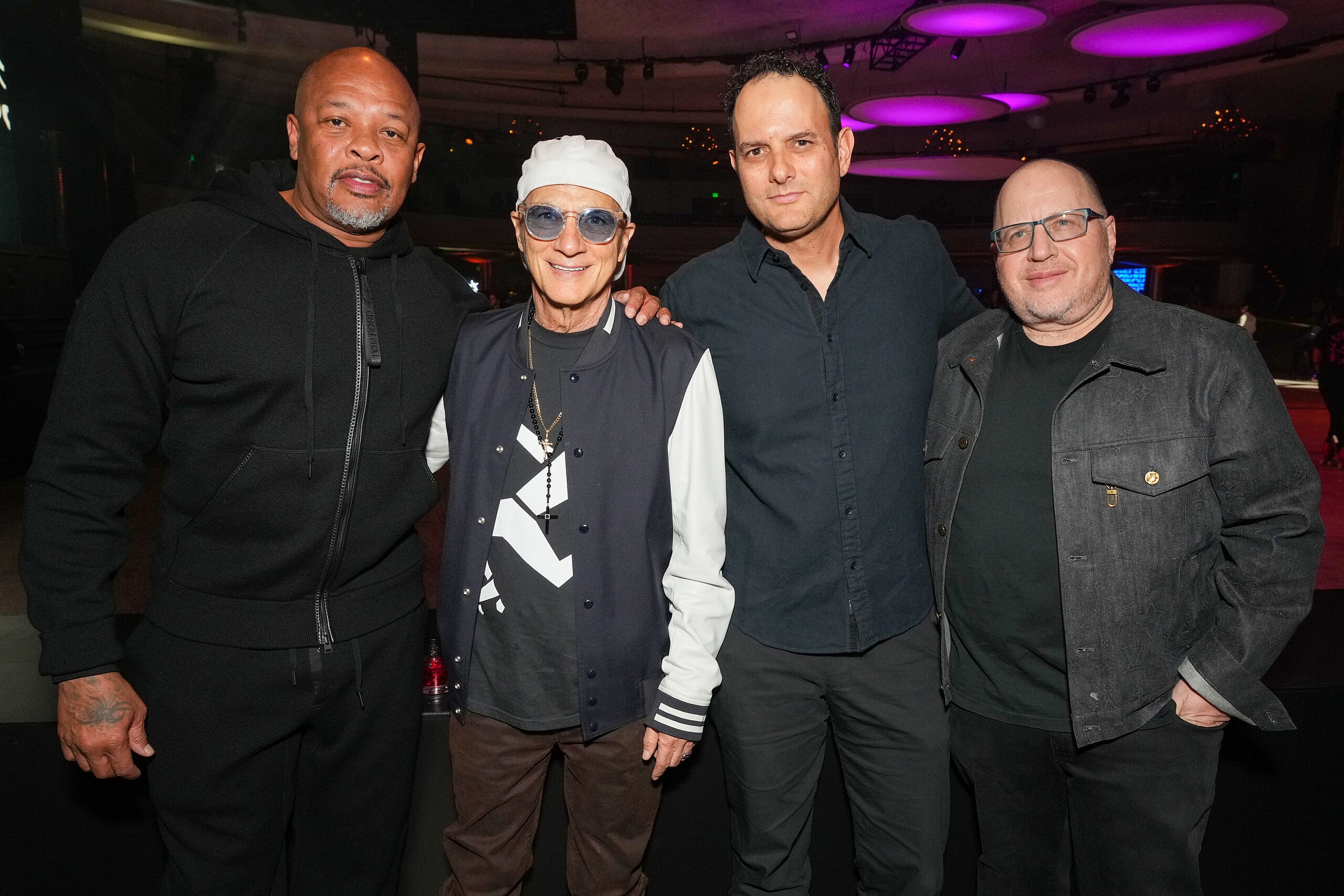 Dr. Dre, Jimmy Iovine, John Janick and Steve Berman attend Interscope x Flipper’s Roller Boogie Palace celebrating Dr. Dre’s “The Chronic” with a star-studded party hosted by Usher and held in partnership with Meta and ORBIT Gum. Guests enjoyed plant-based bites from Tattooed Chef and toasts of PATRÓN EL ALTO at Hollywood Palladium on February 04, 2023 in Los Angeles, California. (Photo by Kevin Mazur/Getty Images for Interscope)