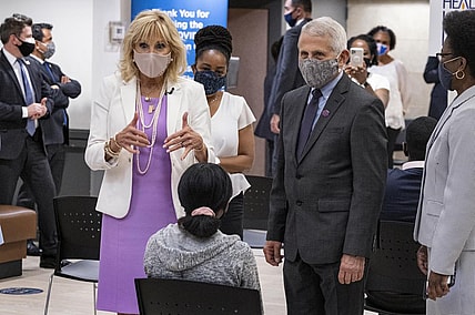First lady Jill Biden and Dr. Anthony Fauci, along with other guests, toured a COVID-19 vaccination site at a Harlem…