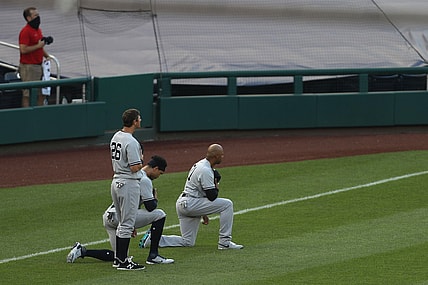Outfielders Giancarlo Stanton and Aaron Hicks became the first Yankees to take a knee during "The Star-Spangled Banner" to protest…