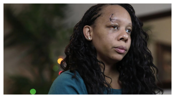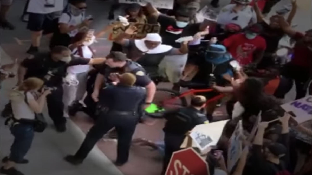 A Black, female police officer intervenes when one of her colleagues becomes violent with a protester that is kneeling on…
